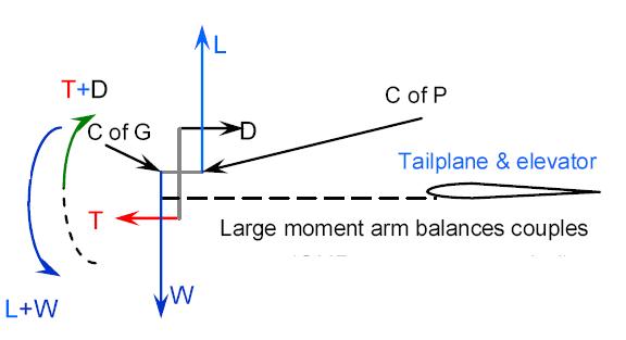 This is called being in a state of equilibrium. Notice that the lift vector is located behind the weight vector. This is referred to as the lift/weight couple. The effect of this is to create a slight turning moment in an anti clockwise (nose down) direction. Also the thrustline is located slightly below the drag line (exaggereted here) which is a slight clockwise moment. The resultant anti-clockwise turning motion is counteracted by the down force generated by the tail plane. This is why it is there! In most aircraft with low thrust lines, increasing thrust causes the nose to pitch up and decreasing the thrust causes the nose to pitch down (because the resultant turning moment favouring the thrust/drag couple). This is particularly desirable if we lost power as if we were to do nothing the aircraft will automatically pitch nose down towards the gliding attitude rather than pitching up towards the stalling attitude.