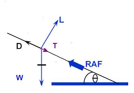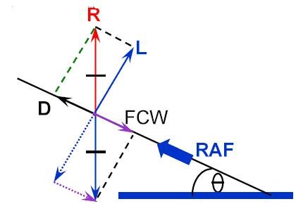 Let us start by looking the lift vector. When we lowered the nose for the glide the lift vector (which acts 90 degrees to the relative airflow) has been inclined forward. Because the lift vector has tilted it has two components: