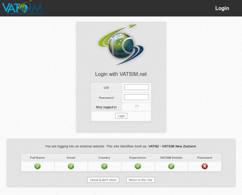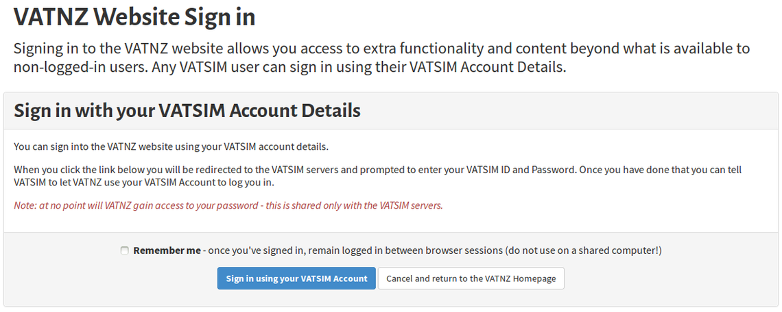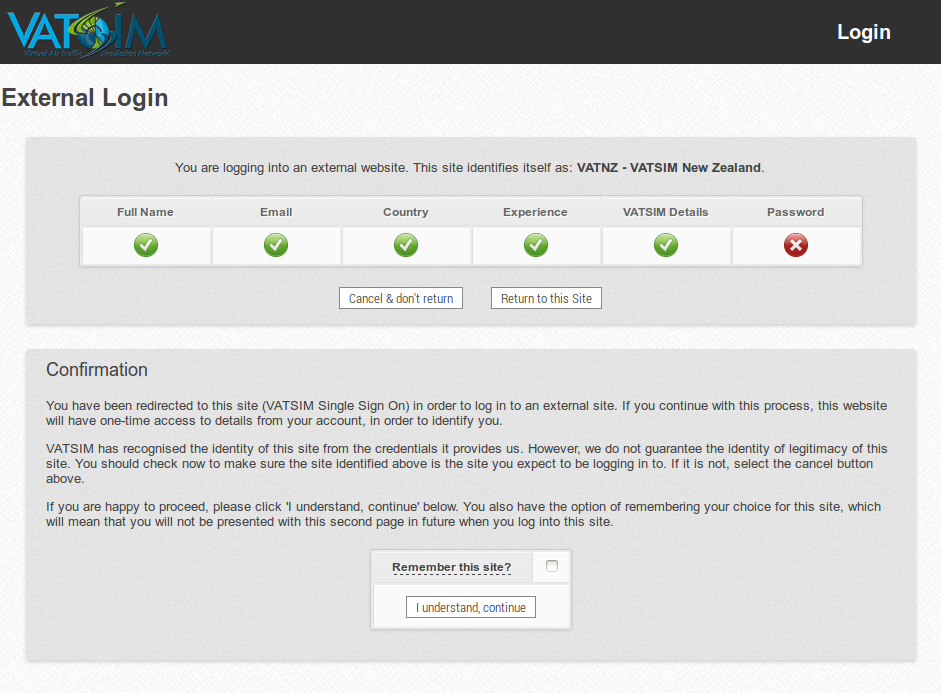 Once you've successfully logged in with your VATSIM Account Details, the VATSIM External Login Screen is displayed. This screen asks you to confirm that you're willing to share your information with the VATNZ website. The two buttons in the top section allow you to cancel the login process. The button at the bottom confirms to VATSIM that they can complete the login process and inform the VATNZ website who you are. The 'Remember this site' checkbox allows you to tell VATSIM that they have your permission to share your details with VATNZ on future occasions. If you check this then the next time you log in using this process, you'll skip this screen; otherwise you have to explicitly give VATSIM the go ahead to tell VATNZ who you are every time you log in.